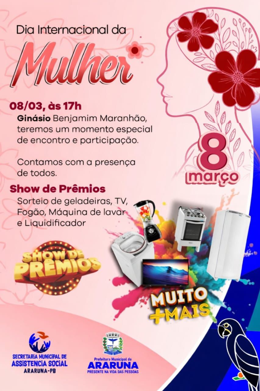 A Prefeitura Municipal de Araruna convida todas as mulheres do município para participarem de um momento muito especial em comemoração ao Dia Internacional da Mulher.